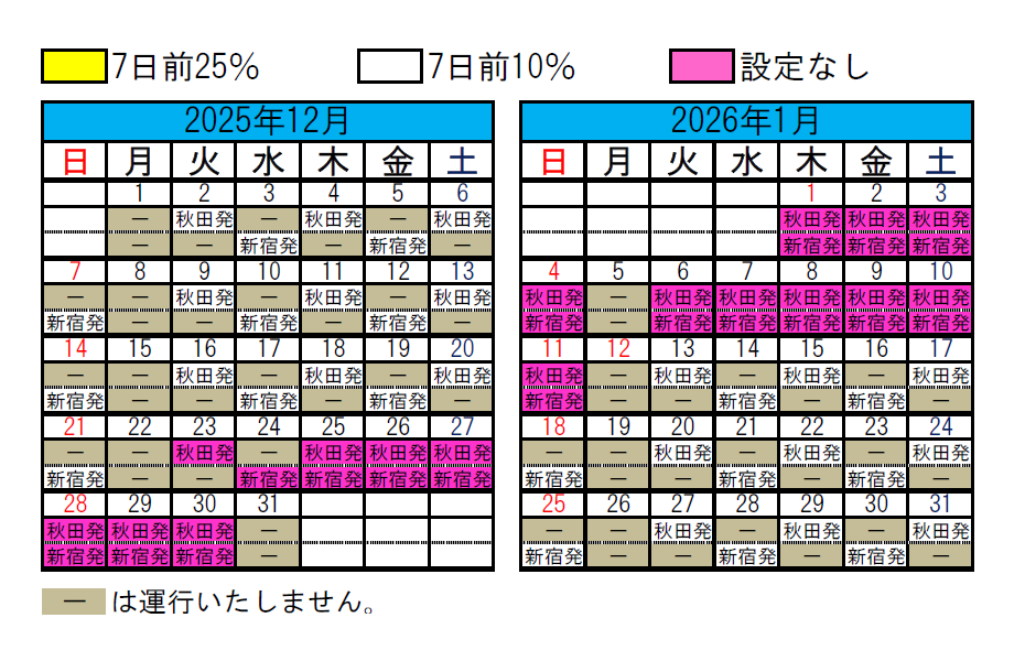 | 閑散期 | 7日前までに購入で25%引き(例:新宿~秋田 7,420円) |